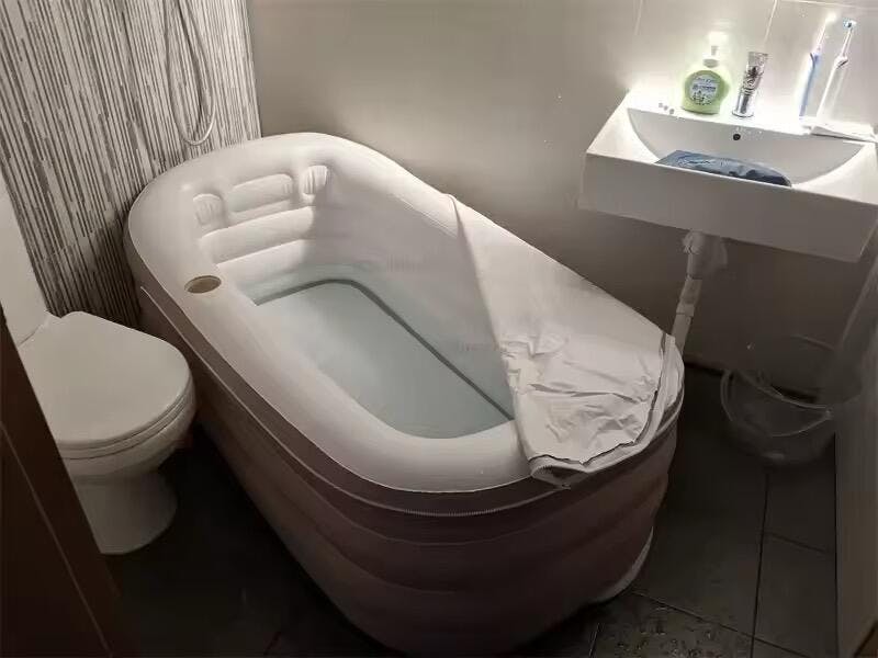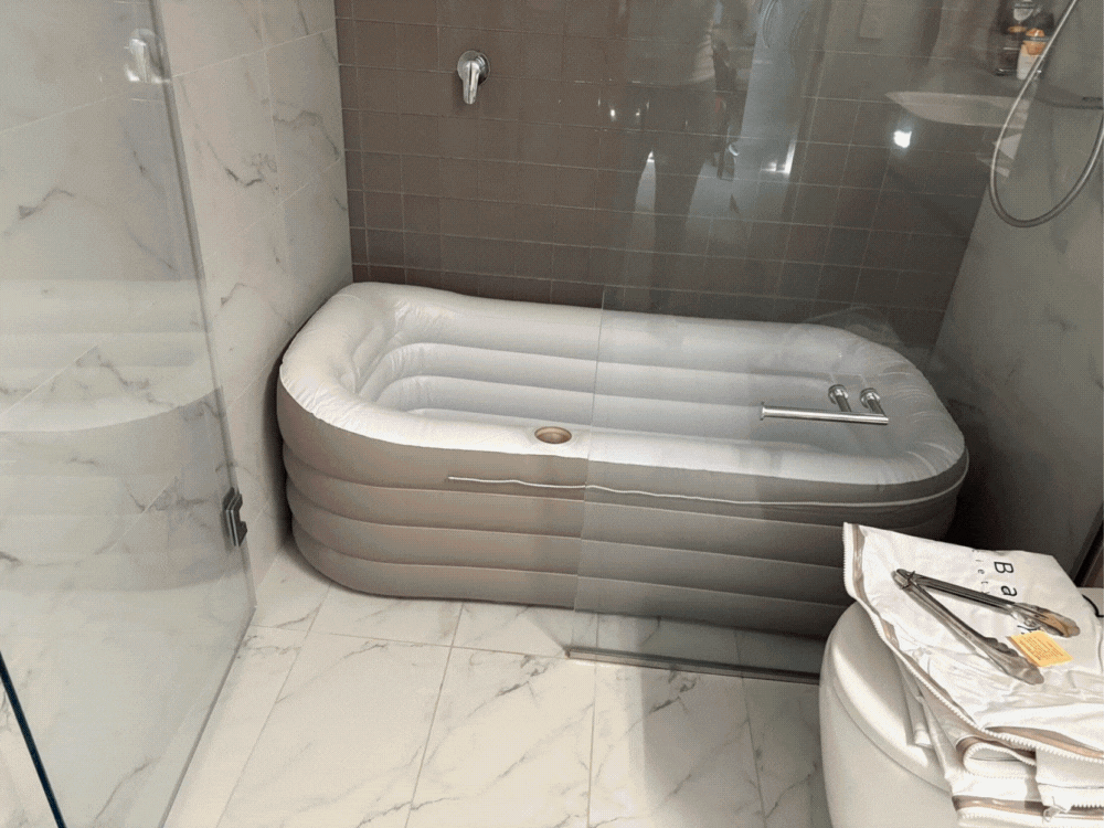 When fully inflated, the tub measures 152 cm long, 82 cm wide and 57 cm deep (59.84 x 32.28 x 22.44 inches). It offers enough space to stretch out and enjoy a comfortable bath.
