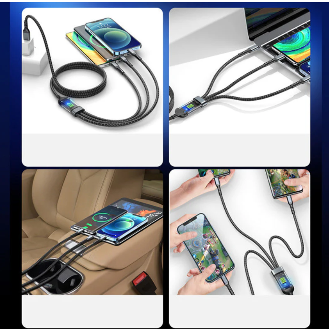 Yksi kaapeli, joka korvaa kaikki muut. Meidän 3-in-1-pikalaturi antaa periksi 100 W teho ja lataa laitteesi jopa 6 kertaa nopeammin kuin tavallinen kaapeli. Matkapuhelimesi, tablettisi tai jopa kannettava tietokoneesi saa luotettavaa virtaa lyhyessä ajassa – missä tahansa oletkin.