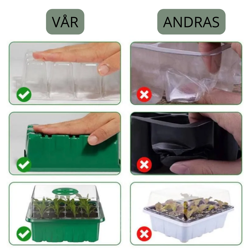 Unngå vanlige problemer som strukket planter på grunn av mangel på lys med vår høye baldakin og effektive LED-belysningMed justerbar ventil til luftsirkulasjon kan du lage optimale forhold for frøene dine og unngå risikoer som rotråte gjennom dreneringshull i hver celle.